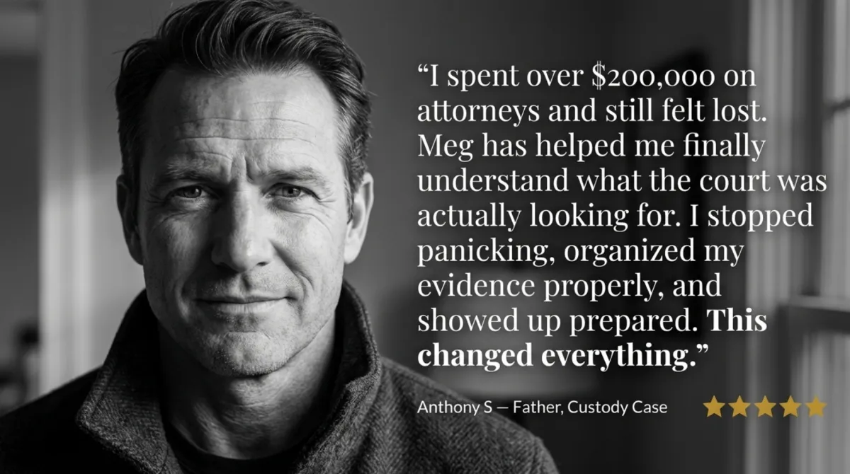 Meg teaches live once per week, guiding members through the court process step by step as it actually unfolds.